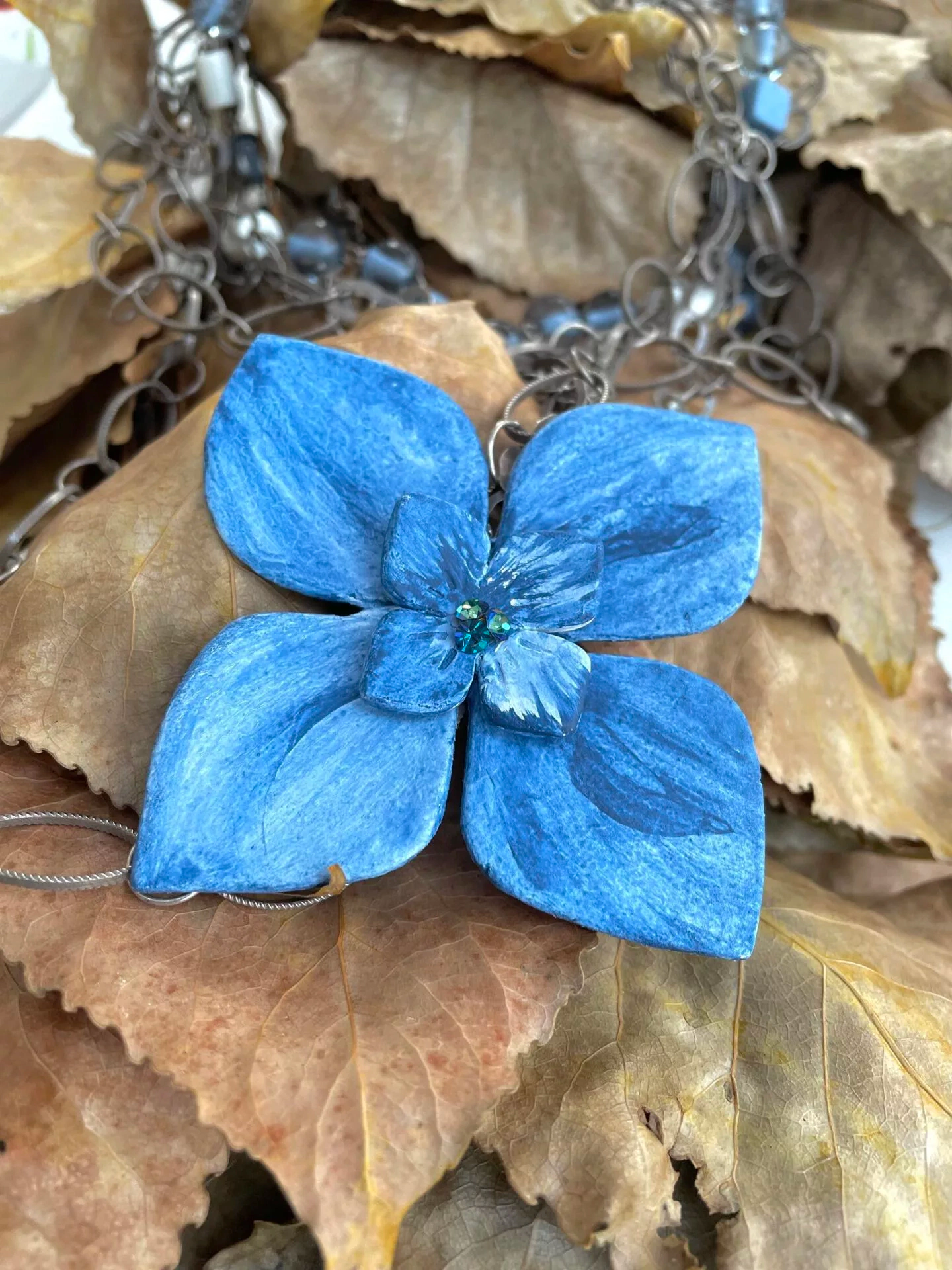 C’est une collection de bijoux lumineux tout en harmonie de teintes bleuies : du papier mâché se mêlant aux formes en laiton découpé aux perles en verre et en résine